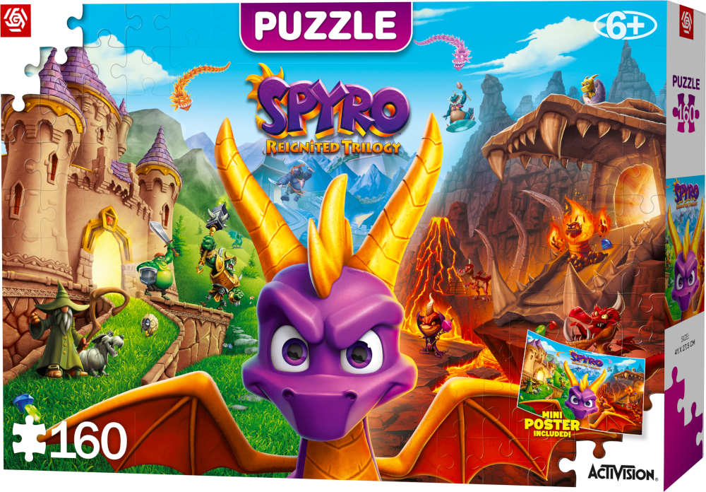 Zestaw ten powstał na podstawie znanej gry wideo dla dzieci Spyro: Reignited Trilogy z charakterystycznym, fioletowym smokiem w roli głównej. To przykład ponadczasowej gry platformowej, w którą mogą bawić się zarówno dorośli jak i dzieci. Dzięki nowym puzzlom możesz ponownie zanurzyć się w świecie tego małego smoka o wielkim sercu.