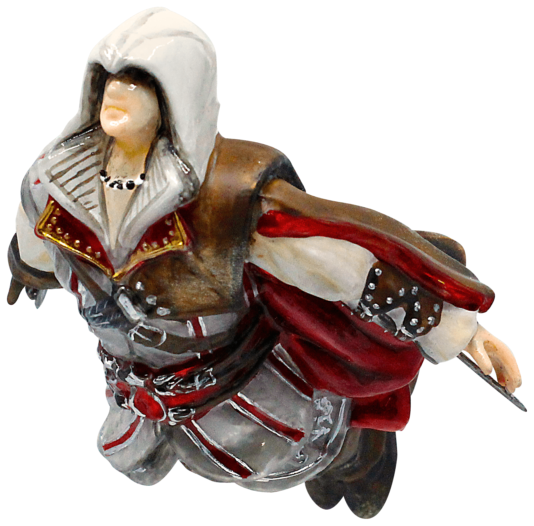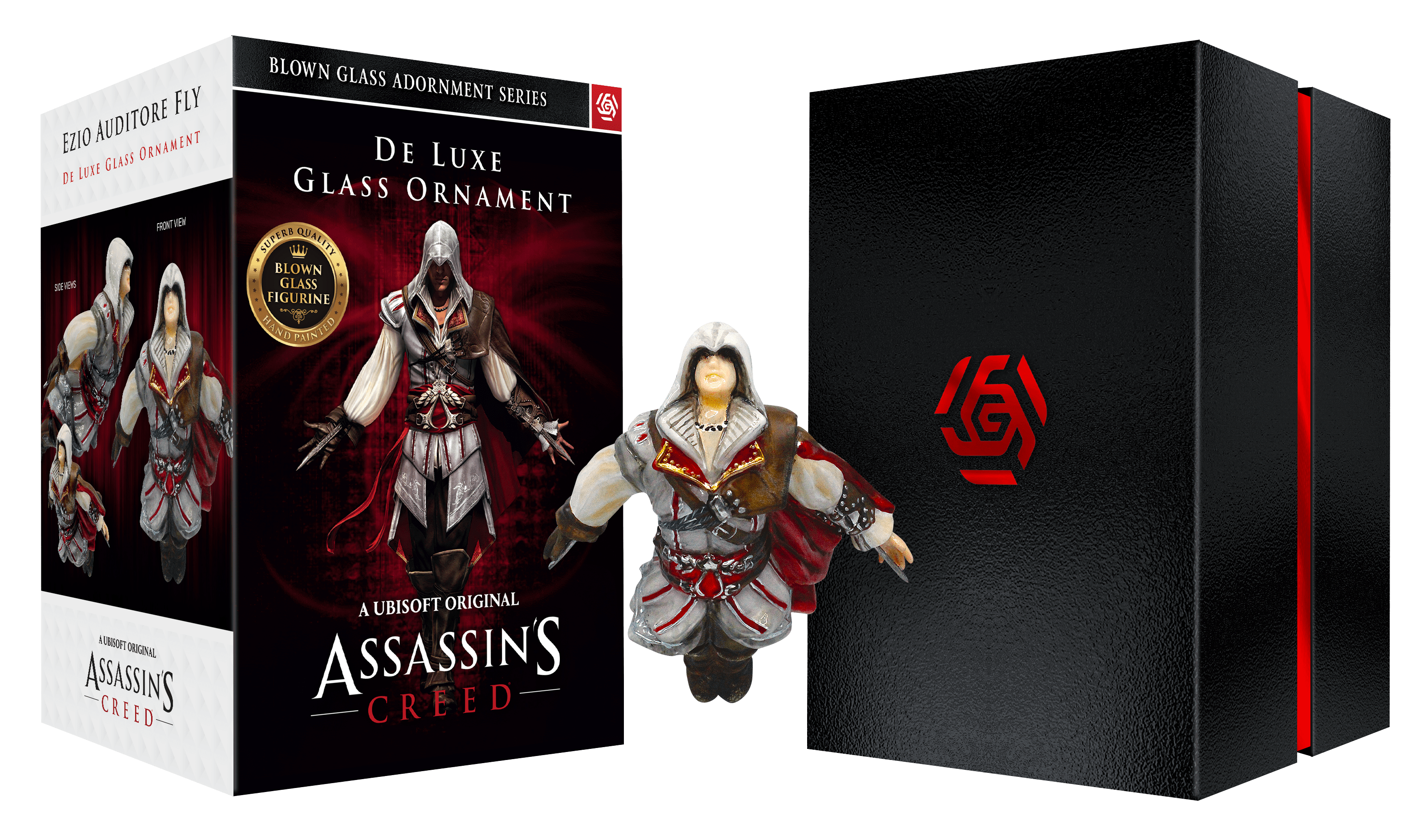 Ezio Auditore to jeden z najsłynniejszych i najbardziej kultowych asasynów z serii Assassin’s Creed. Ta piętnastocentymetrowa, ręcznie malowana, całoroczna szklana ozdoba przedstawia Ezio w akcji, wyskakującego w powietrze i spadającego ku kolejnej walce.